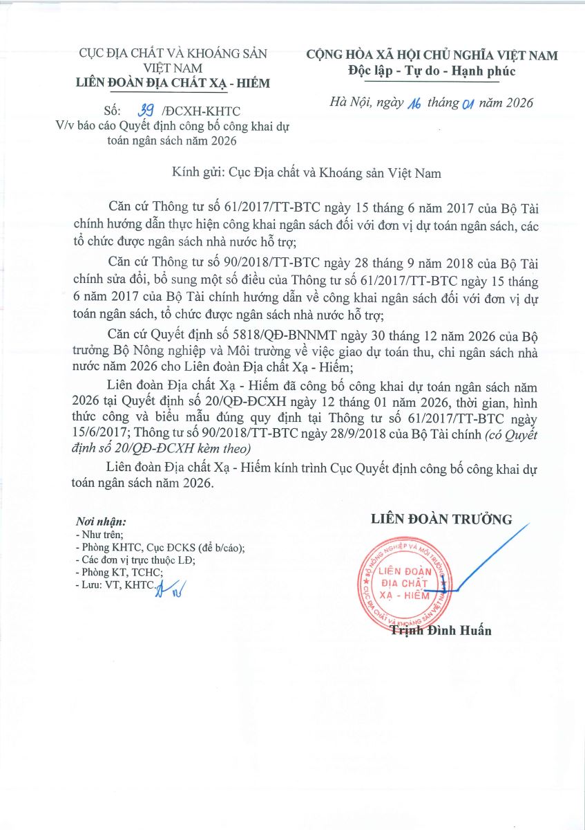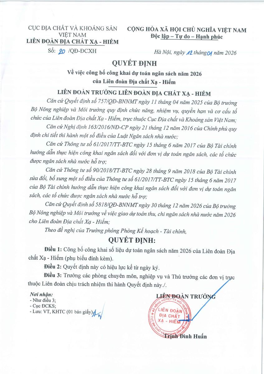 QUYẾT ĐỊNH VỀ VIỆC CÔNG BỐ CÔNG KHAI DỰ TOÁN NGÂN SÁCH NĂM 2026 CỦA LIÊN ĐOÀN ĐỊA CHẤT XẠ - HIẾM