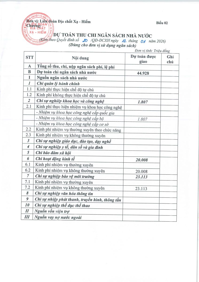 - QUYẾT ĐỊNH VỀ VIỆC CÔNG BỐ CÔNG KHAI DỰ TOÁN NGÂN SÁCH NĂM 2026 CỦA LIÊN ĐOÀN ĐỊA CHẤT XẠ - HIẾM