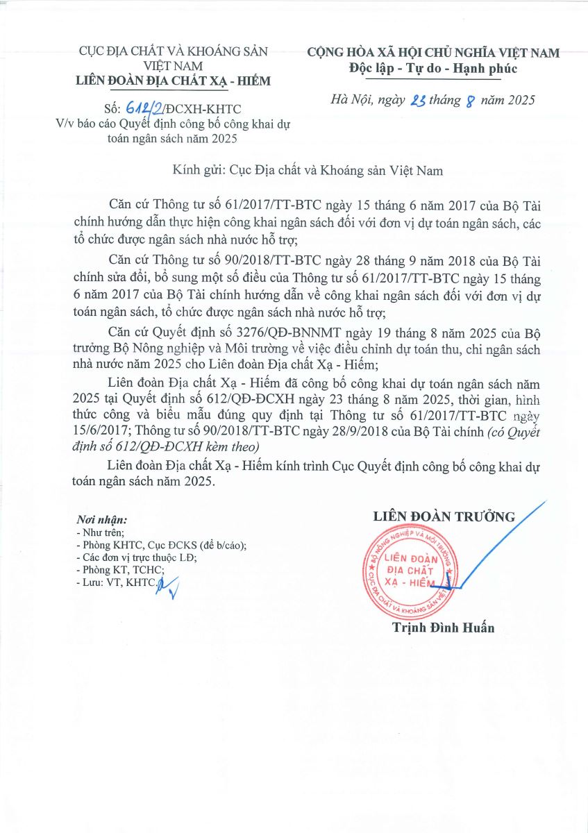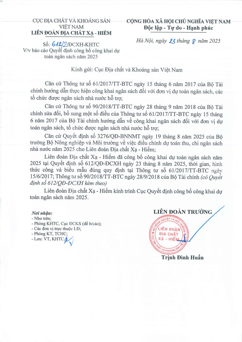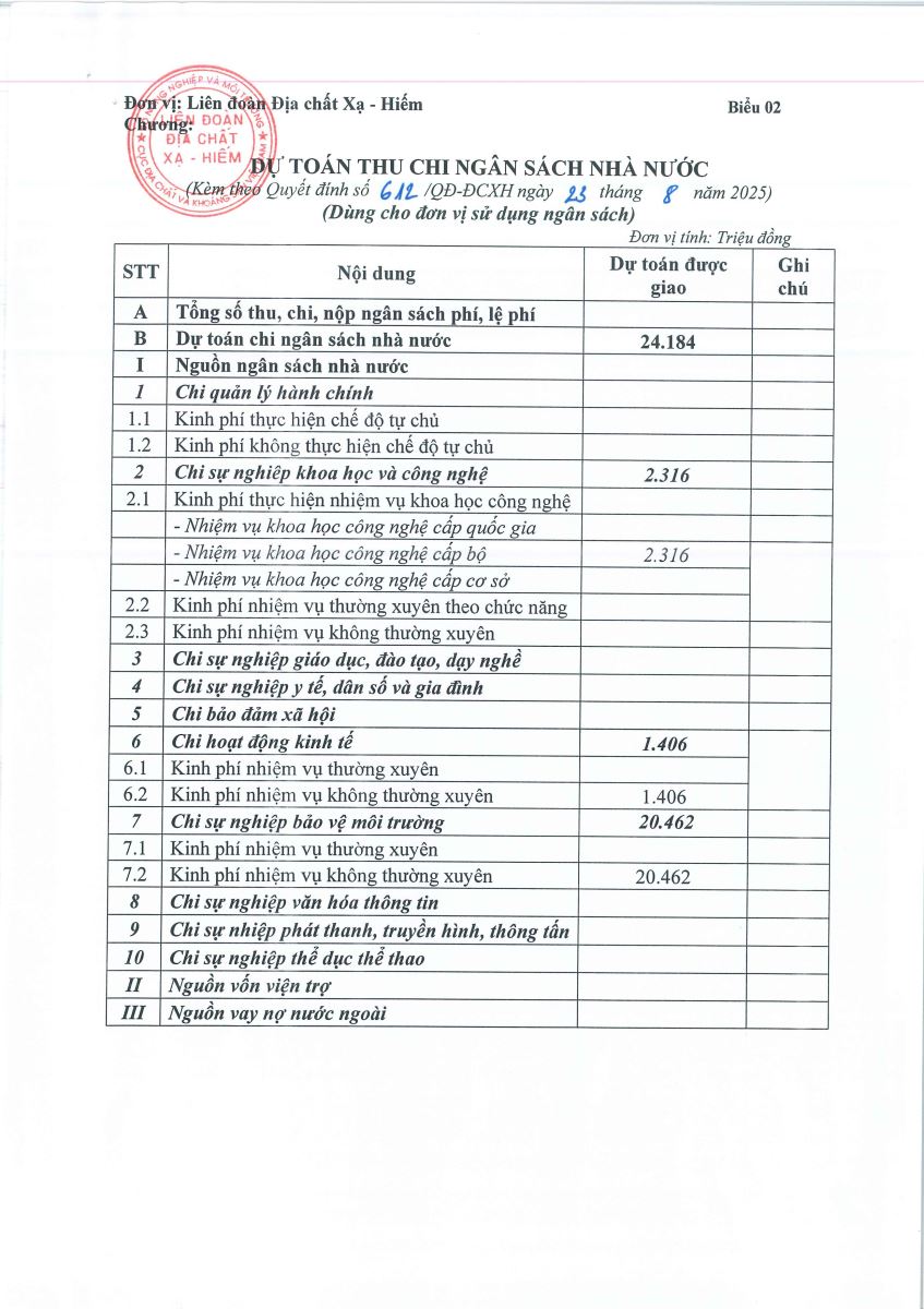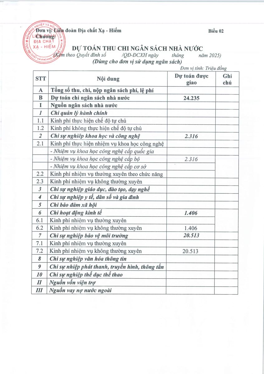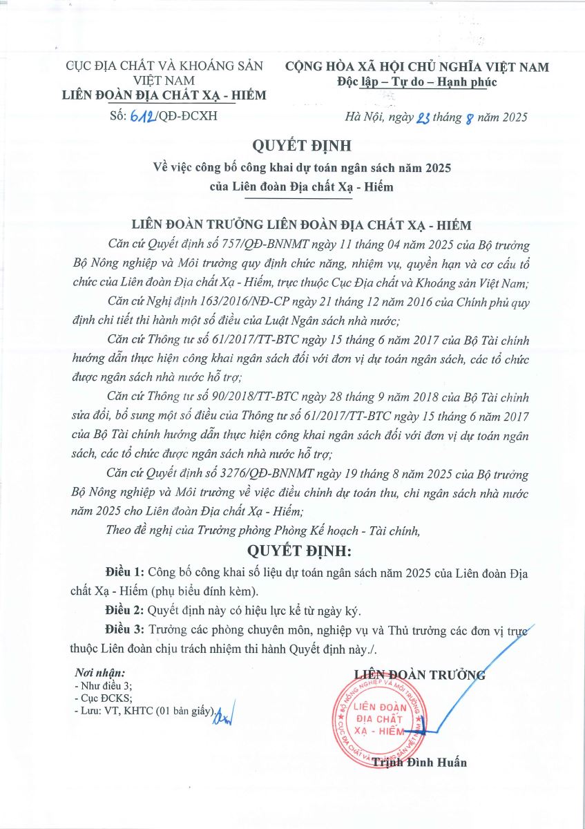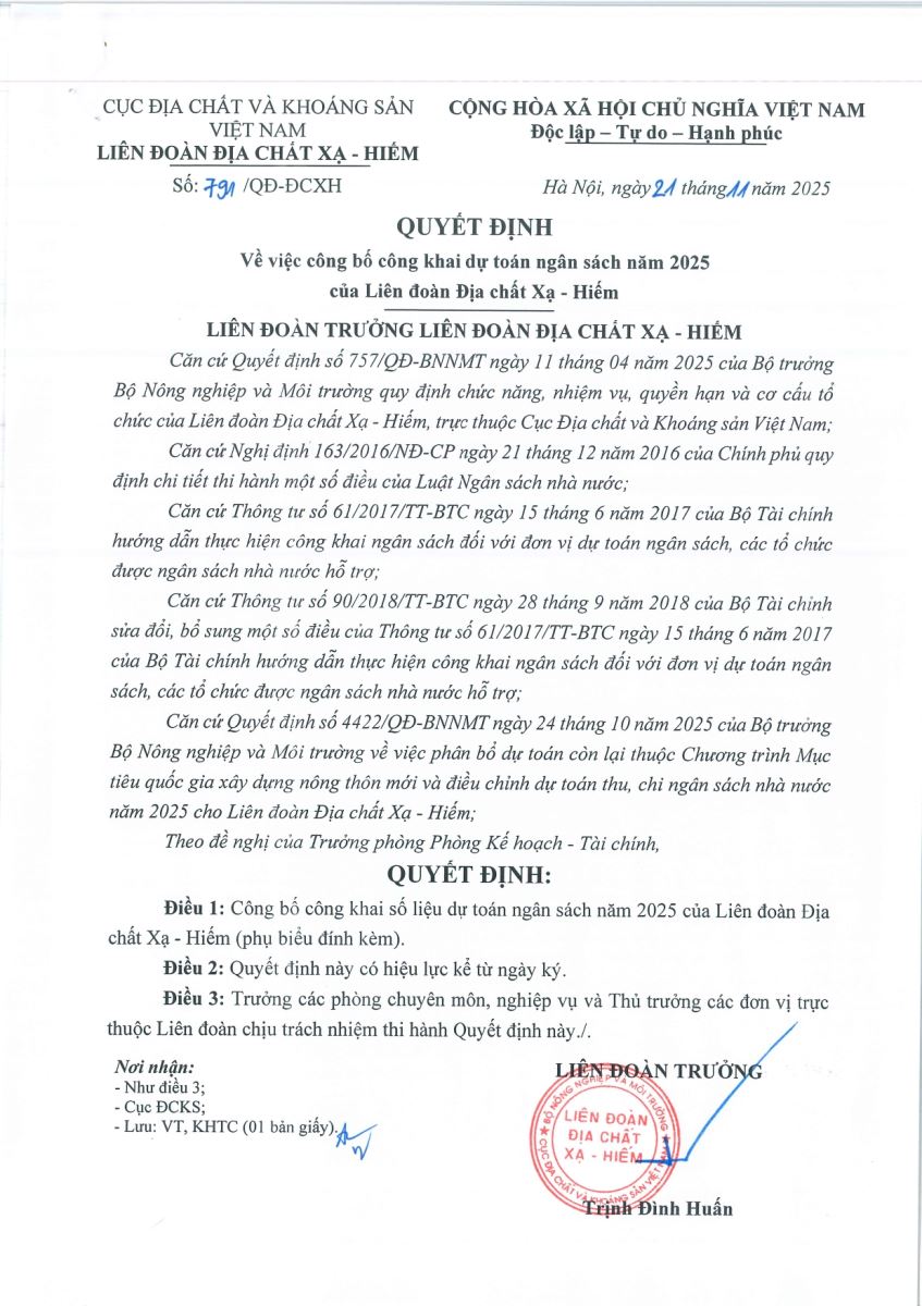 - QUYẾT ĐỊNH VỀ VIỆC CÔNG BỐ CÔNG KHAI DỰ TOÁN NGÂN SÁCH NĂM 2025 CỦA LIÊN ĐOÀN ĐỊA CHẤT XẠ - HIẾM