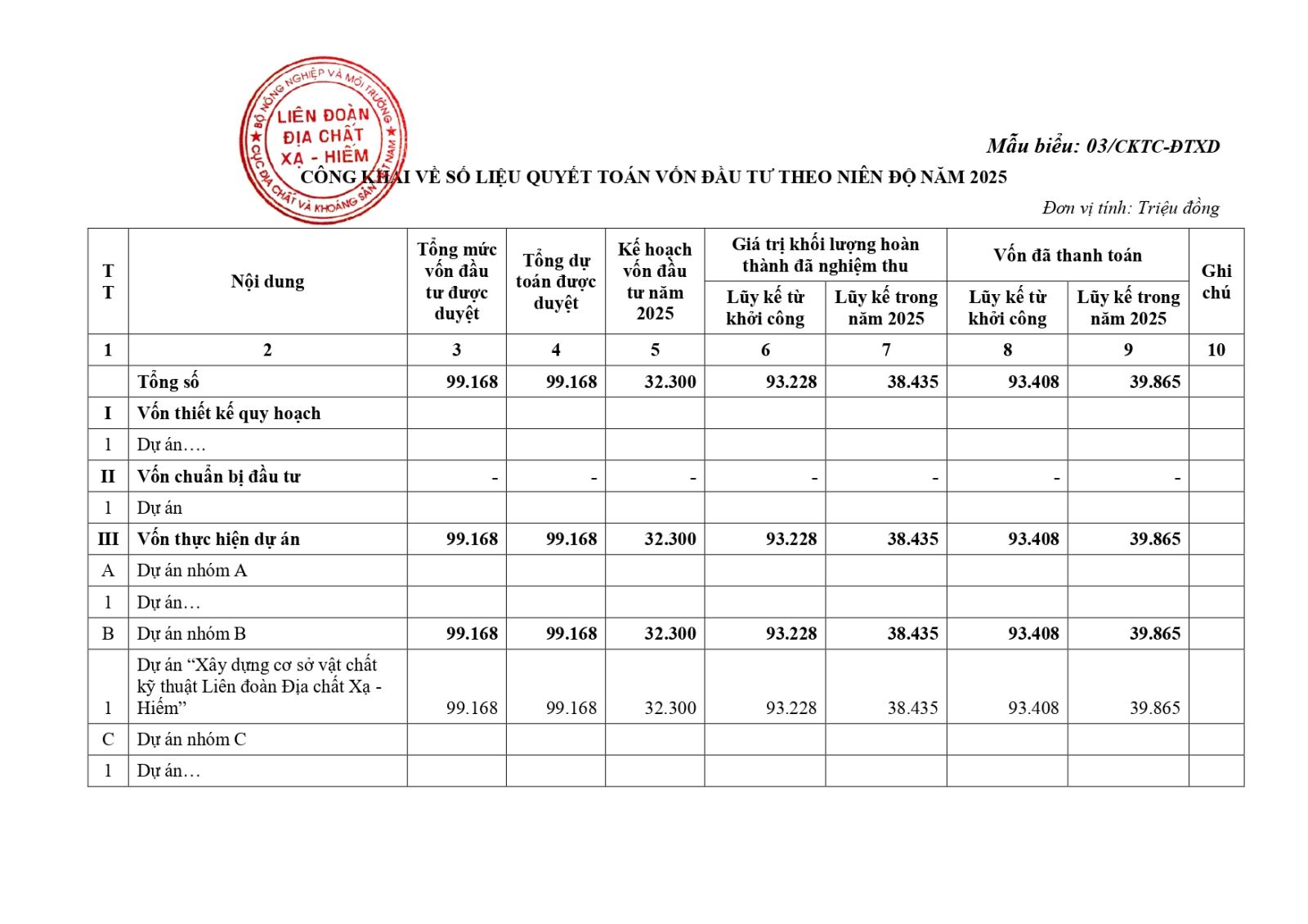 - QUYẾT ĐỊNH VỀ VIỆC CÔNG BỐ CÔNG KHAI SỐ LIỆU QUYẾT TOÁN VỐN ĐẦU TƯ CÔNG NIÊN ĐỘ NĂM 2025 CỦA LIÊN ĐOÀN ĐỊA CHẤT XẠ - HIẾM
