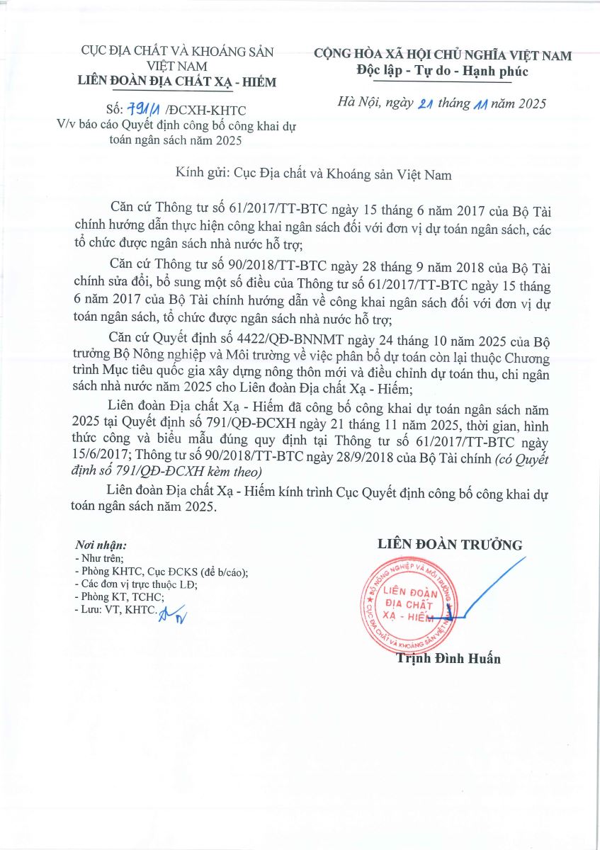 - QUYẾT ĐỊNH VỀ VIỆC CÔNG BỐ CÔNG KHAI DỰ TOÁN NGÂN SÁCH NĂM 2025 CỦA LIÊN ĐOÀN ĐỊA CHẤT XẠ - HIẾM