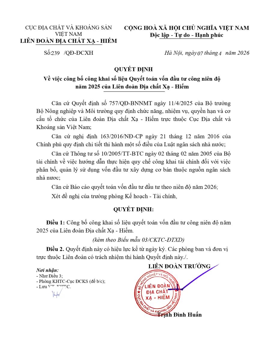 - QUYẾT ĐỊNH VỀ VIỆC CÔNG BỐ CÔNG KHAI SỐ LIỆU QUYẾT TOÁN VỐN ĐẦU TƯ CÔNG NIÊN ĐỘ NĂM 2025 CỦA LIÊN ĐOÀN ĐỊA CHẤT XẠ - HIẾM